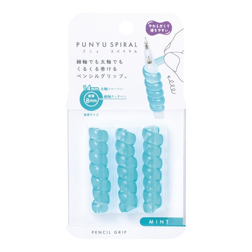 細軸でも太軸でもくるくる巻けるペンシルグリップ。細軸(約8mm)から太軸(約14mm)の筆記具に取付可能。疲れにくくスパイラル形状が指にフィット。巻いて付けるので付け外しが簡単。