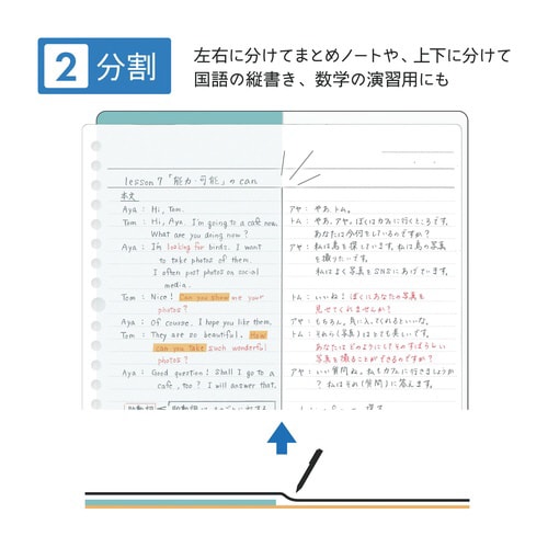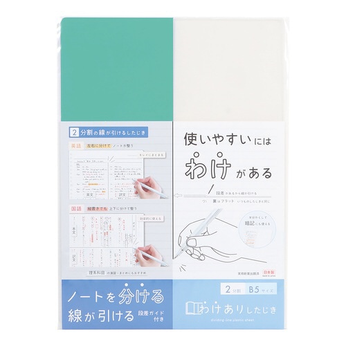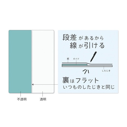 ノートを分ける線が引けるしたじき。ノートに定規なしで2分割の分割線が引ける段差ガイド付。不透明部分でノートを隠して暗記学習もできる。裏側はフラットで通常の下敷きとして使える。 |