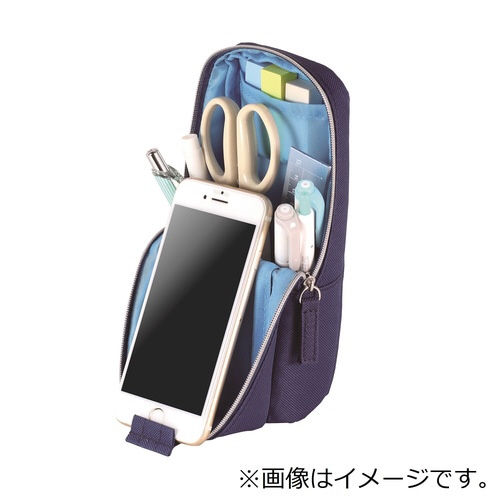 置くだけでピタッと倒れないペンケース。片手ですぐに外せる。スマホを縦にも横にも立てられる。消しゴムや付箋が入る小物ポケット付。ペンは約20本収納可能。 |