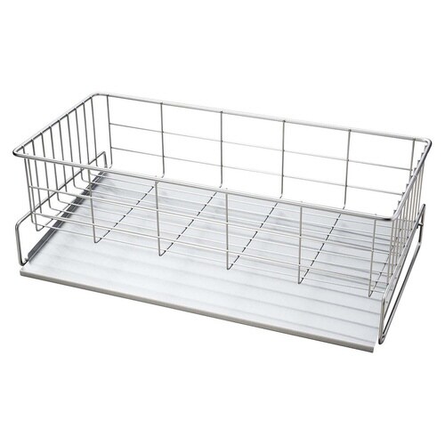 丈夫で衛生的なステンレス製の水切りバスケットです。トレーが傾斜しているので、自然にシンクに水が流れるから、水捨ての必要がありません。お皿を立てて置けるので水切れがよく乾きが早いです。 |