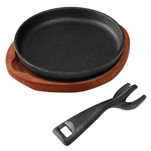自宅でお店の味を楽しめるステーキ皿 丸型17cm 保温性に優れ、冷めにくいので美味しさ長持ち 専用のハンドル付きなので持ち運び安心 ガス火、IH両対応 セット内容 |