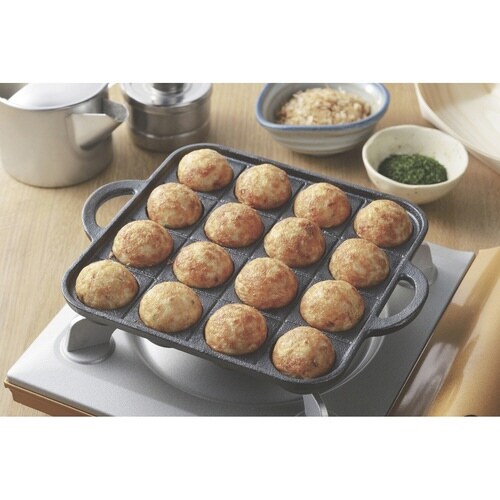 鉄鋳物製のたこ焼きプレートです。 食材に均一に熱が加わり、旨味を閉じ込め、おいしく仕上がります。 蓄熱性・保温力に優れ、最後まで熱々の料理が楽しめます。 ガス火専用です。 |