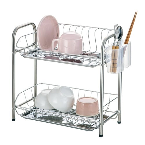 シンクサイドに置けるスリムサイズの水切りラックです。 水受けはスライド式で簡単に取り出せます。 お皿を立てて置けるので水滴を拭く量が減らせます。 細かい物をまとめられるポケット付きです。 |