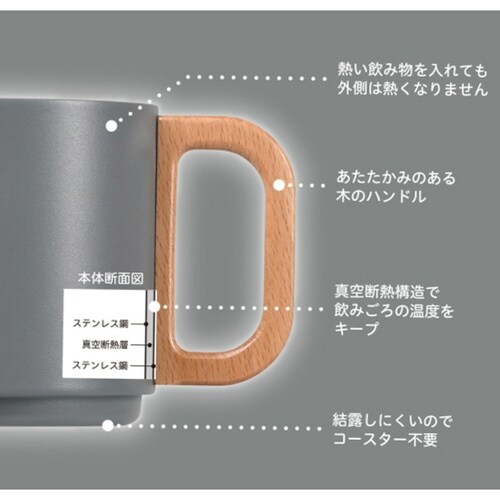 熱い飲み物は長時間保温し、冷たい飲み物も氷が溶けにくく長く冷たいままキープできる真空マグカップです。 熱い飲み物を入れても外側が熱くならないので安心して持つことができます。 |