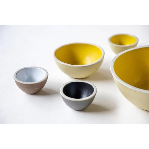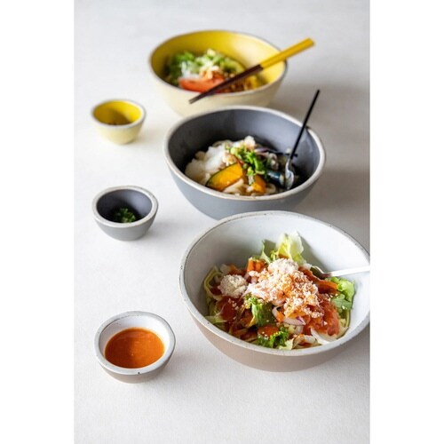 ヤシの実みたいなぽてっとした形のボウルです。 パッと目を引くカラーリングで食卓を鮮やかに演出します。 ソースやケチャップなどを入れるのにちょうどいいサイズ感です。 小物入れとして使うのもおすすめです。 |