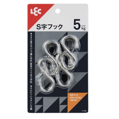 サビに強く、重い物も吊るせるステンレスタイプのフック、12個入りです。 耐荷重5kgです。 タオル掛けやパイプ棚での使用に最適です。 |