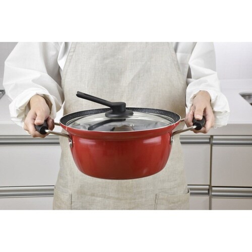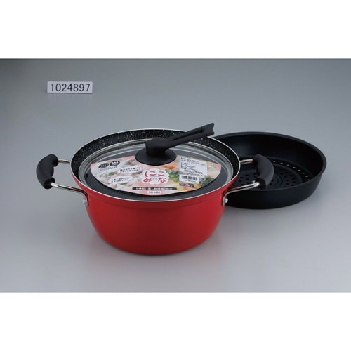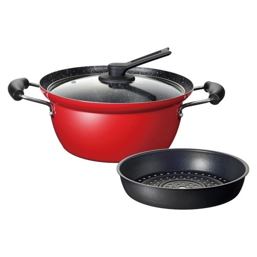 蒸し目皿付きの実用的な両手鍋24cmです。 段付きのフチが付いているので、ふきこぼれにくいです。 クイックマーブルコートでこびりつきにくく、お手入れ簡単です。 |