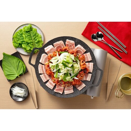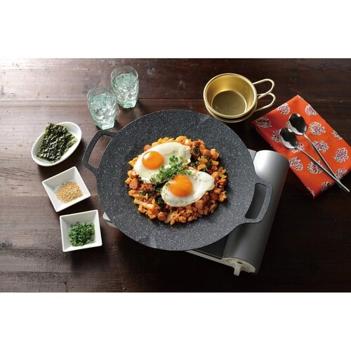 キャンプ料理から毎日のおうちごはん、本格的な韓国料理まで幅広い調理に便利にお使い頂けるマルチグリドルです。 熱伝導のよいアルミ製で、料理がムラなくおいしく仕上がります。 |