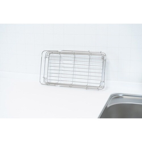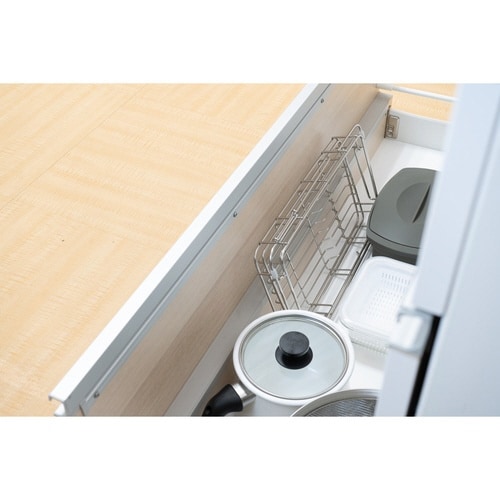 シンクに掛けて水切りができるスライド式の水切りバスケットです。 作業スペースが広がり、料理がしやすくなります。 お皿やコップはもちろんミルクパンなど小さめのお鍋もしっかり置けます。 |