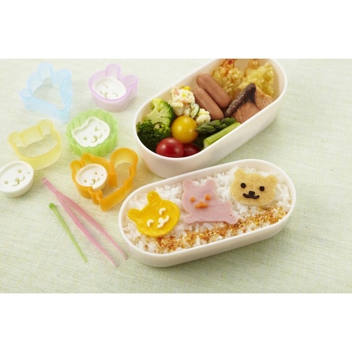 ハムやチーズ、野菜などをキュートな動物に変身させる抜き型5種のセット 表情を入れかえられるので、アレンジも楽しい 食材の押し出しや細工に便利な、ピックとピンセット付き! |