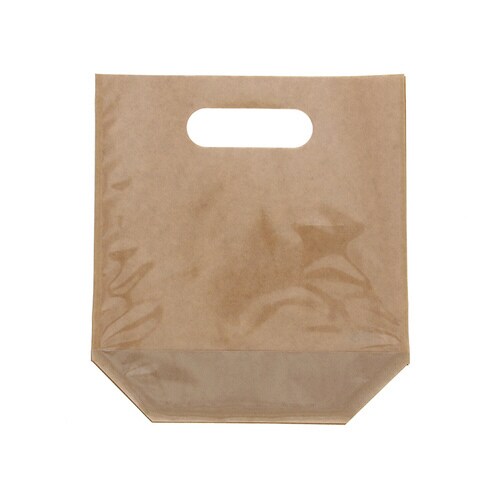 クラフト紙の質感で、手作り感とナチュラル感を演出する手抜き底ガゼット袋です。CO2の削減と環境負荷の軽減を目的として紙資材を使用し、さらにフィルムを活用することで中身も見えます。 |