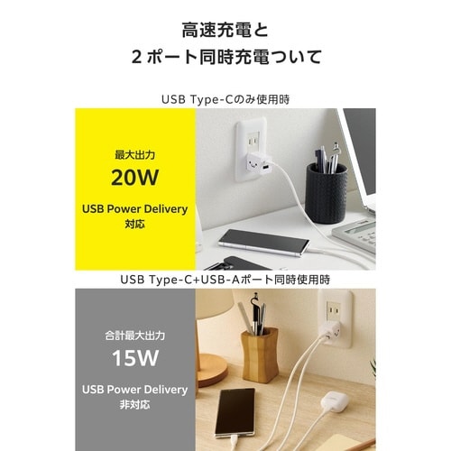 エレコム 充電器 USB Type−C 20W PD対応 2ポート USB−C USB−A ホワイト×ブラック