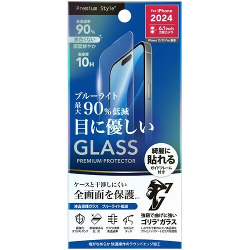 iPhone 16/15/15 Pro用 液晶保護ガラス 2倍強化/ゴリラガラス ブルーライトカット/高透明