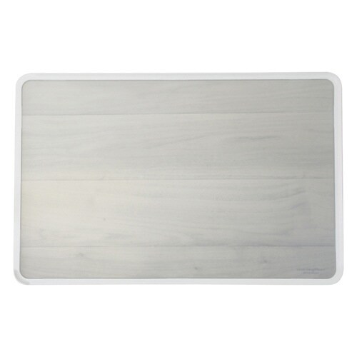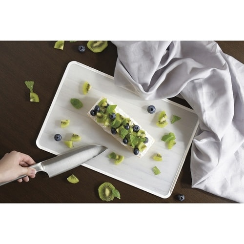 カットできるスペースが広く、たくさんカットできるまな板です。食材をこぼさず移動できるガード付きです。フラット面には滑りにくいストッパー付きなので、安全にお使いいただけます。 |