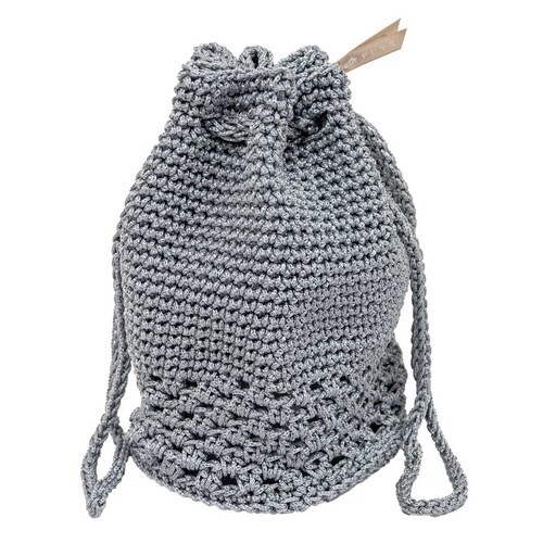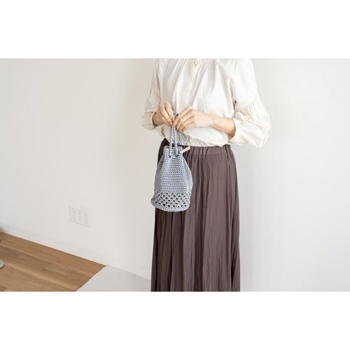 巾着型の丸いフォルムが可愛いドローストリングバッグです。 軽くて丈夫なポリプロピレンの糸を用いてかぎ針編みで編んでいます。 細編みと飾り編みを使った手の込んだデザインが涼し気です。 |