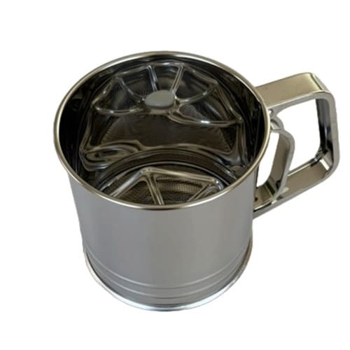 片手でラクラク使え、周りに飛び散りにくい粉ふるいです。 中に粉を入れて、ハンドルを握ったり離したりすると粉がふるえます。 キメが細かくなり、ダマになりくい生地が作れます。 |