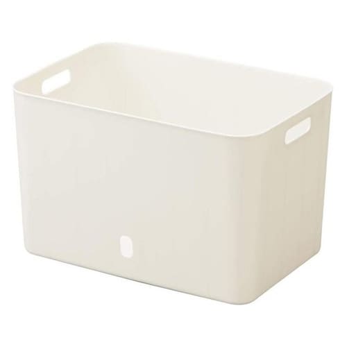 ポリエチレン素材のやわらかい収納ボックスです。 片手でも引き出しやすいように指を引っ掛ける抜穴が空いています。 カラーボックスに様々な大きさを組み合わせて収納できます。 |