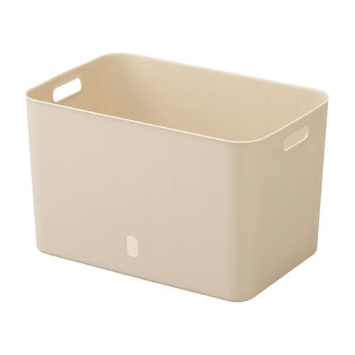 ポリエチレン素材のやわらかい収納ボックスです。 片手でも引き出しやすいように指を引っ掛ける抜穴が空いています。 カラーボックスに様々な大きさを組み合わせて収納できます。 |