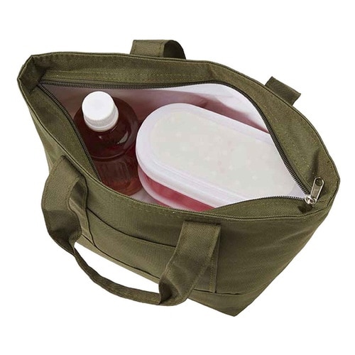 内側がEVA樹脂(耐水性)のトート型の保冷弁当袋です。 冬場の弁当袋としても使用できます。 外側正面に1ヶ所ポケット付きです。 |
