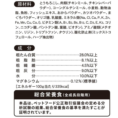 とうもろこし、肉類(チキンミール、チキンレバーパウダー)、コーングルテンミール、小麦粉、動物油脂、魚粉、フィッシュエキス、おからパウダー、カツオパウダー、まぐろ ※一部は外装記載