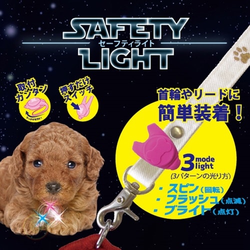 取付簡単なお散歩用安全ライト。回転フラッシュ・フラッシュ・点灯の3モード選択可能。 |