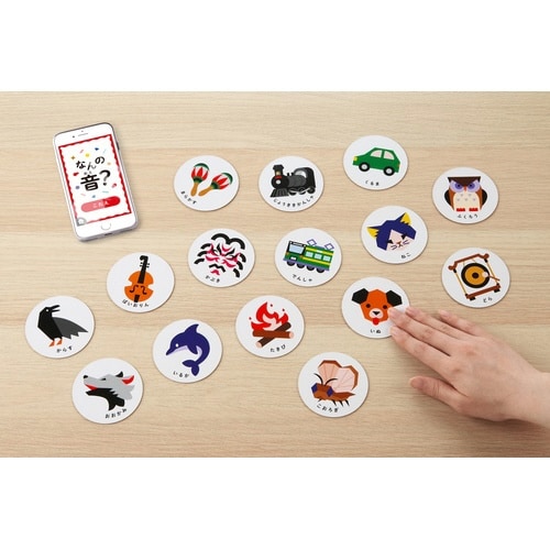 音をきいて札をとろう。効果音が読み札になる、新感覚のカルタです。カード57枚+無地3枚つき。アプリには、まねっこモード、ミックスモード、DJモードなどあります。 |
