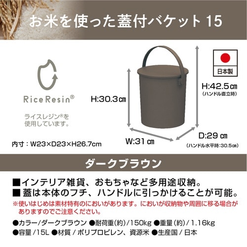 バスケット お米を使った蓋付バケット 15L ライスレジン ダークブラウン ※2個以上から注文可能(販売価格は1個単位の価格)