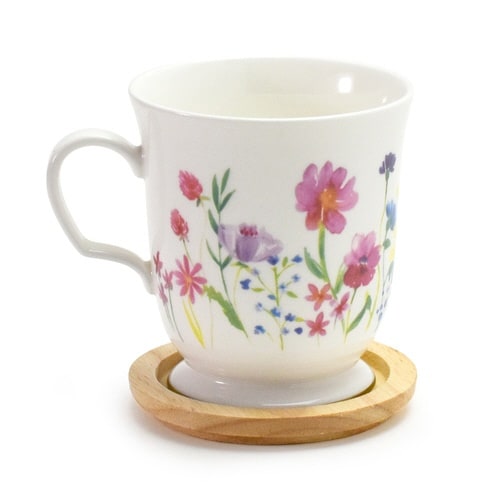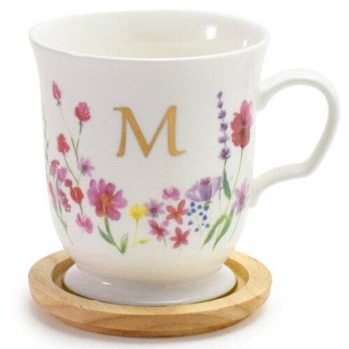 花柄が素敵な木蓋付きイニシャルマグカップです。 ゆったりティータイムをお楽しみいただけるたっぷりサイズの350mlです。 蓋付きで埃の侵入や温かい飲み物が冷めるのを防ぐことができます。 |