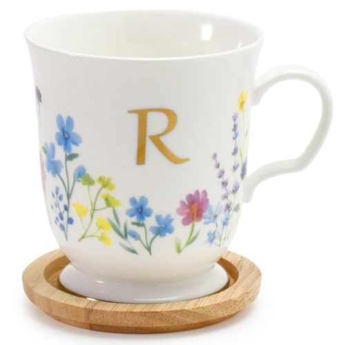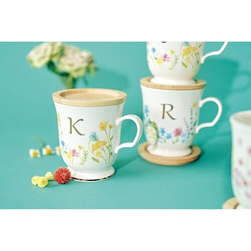 花柄が素敵な木蓋付きイニシャルマグカップです。 ゆったりティータイムをお楽しみいただけるたっぷりサイズの350mlです。 蓋付きで埃の侵入や温かい飲み物が冷めるのを防ぐことができます。 |