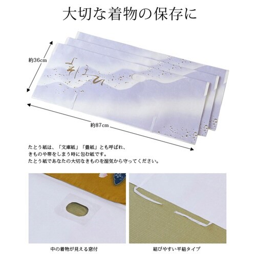 大切な着物をホコリや湿気から守る保管用たとう紙です。 3枚入りです。 小窓付きで収納物を確認できます。 平紐タイプなので結びやすくほどけにくいです。 |