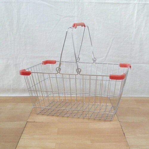 プラスチックの持ち手が付いたハンドル付きのワイヤーバスケットです。 バスケットの角にもプラスチックパーツが付いていて、シンプルなバスケットのアクセントになっています。 |