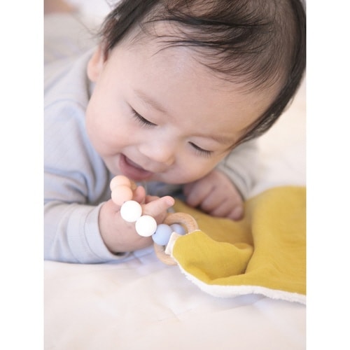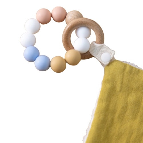 歯固めにもなるシリコンと天然木のベビーリングとおもちゃハンカチのセットです。 シリコンと天然木の異なる質感で、離乳食準備の噛む練習やムズムズストレスを発散できます。 |