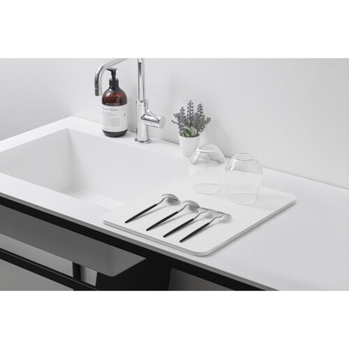速乾性が高い「ラバストーン」なので手軽に手早くさっと乾かせます。 使わない時は立て掛けて置けば場所を取らず作業スペースを広々使えます。 キッチン以外の水浸しになりやすいシーンにもお使いいただけます。 |