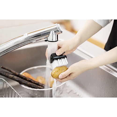 コンパクトなサイズで場所を取らず小回りが利いて隅々までキレイにできます。 コシの強いナイロン毛が、まな板やザルの網目に詰まった汚れをしっかりかき落とします。 |