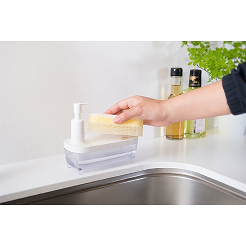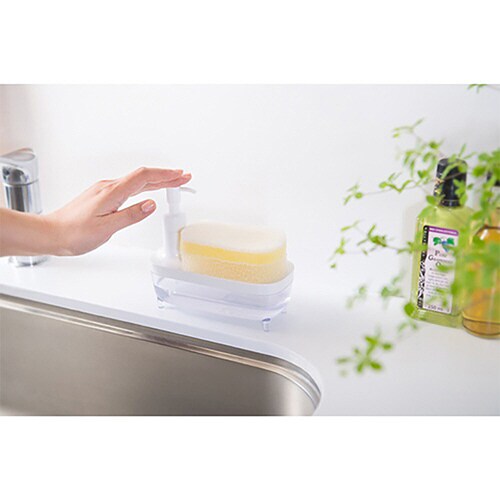 スポンジが置けるディスペンサーです。 ディスペンサーとスポンジトレーが一体となっているので場所をとらず、片手でスポンジに洗剤をつけることができます。 |