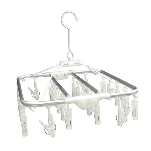 シンプルな見た目で清潔感のある角ハンガーです。 ピンチは24個付いています。 外に干したくない下着や小物干しに便利なサイズです。 アルミフレームなので軽くて汚れがつきにくいです。 |