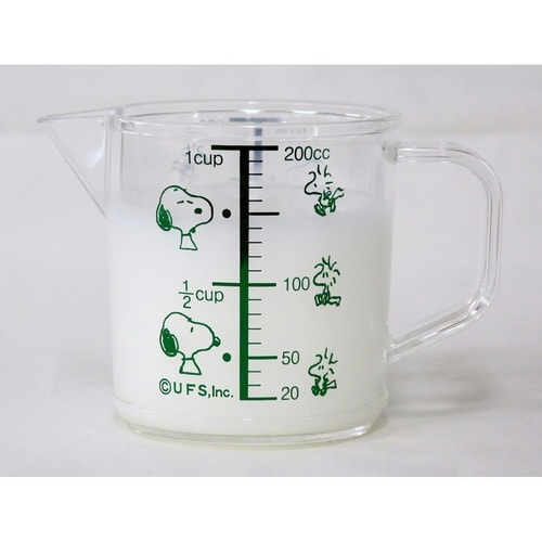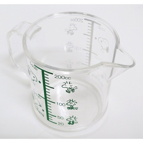 メモリ部分にスヌーピー・ウッドストックが描かれている可愛い計量カップです。 計量しやすいメモリ付きで、200mlまで量れます。 熱湯も使用可能です。(電子レンジは不可) 注ぎやすい注ぎ口です。 |