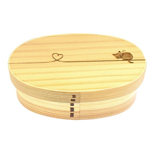 かわいいプリントが蓋にデザインされている曲げわっぱ弁当箱です。 杉材本来の色を貴重としたウレタン塗装が施されています。 内容量は600mlです。 |
