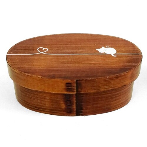 かわいいプリントが蓋にデザインされている曲げわっぱ弁当箱です。 木目に深みが増す漆塗装が施されています。 内容量は400mlです。 |