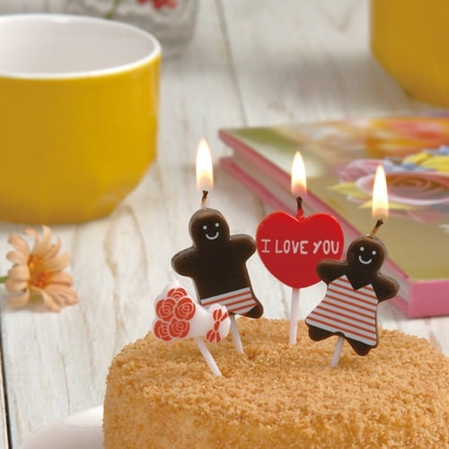 ハートや花束、キッチュな人形のキャンドルがセットになっています。 ケーキやお料理に挿してパーティーを盛り上げるピック付キャンドルです。 |