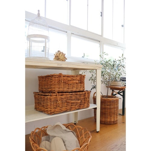 風合い豊かな皮つきラタン製バゲッジバスケットです。 こだわりの天然素材「皮つきラタン」の味わいを楽しめます。 リビングの収納バスケットとしてインテリアを楽しみながら収納できます。 |