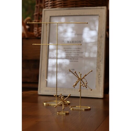 お気に入りのアクセサリーをディスプレイ出来るアクセサリースタンドです。 真鍮風の加工を施した華やかなデザインです。 台座部分には細かなアクセサリー類もディスプレイできます。 |