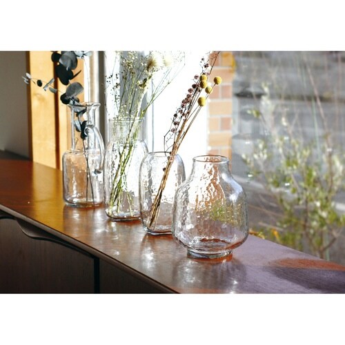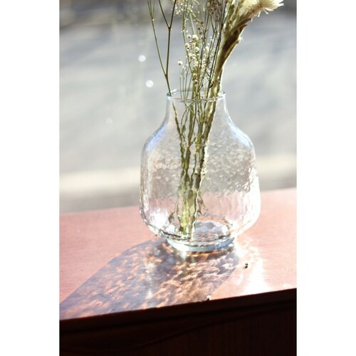 ハンドメイドのガラス製のフラワーベースです。 シンプルながら凸凹が特徴的なデザインです。 ガラスが光をキラキラと反射させ空間を演出します。 |