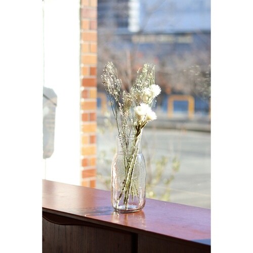 ハンドメイドのガラス製のフラワーベースです。 シンプルながら凸凹が特徴的なデザインです。 ガラスが光をキラキラと反射させ空間を演出します。 |