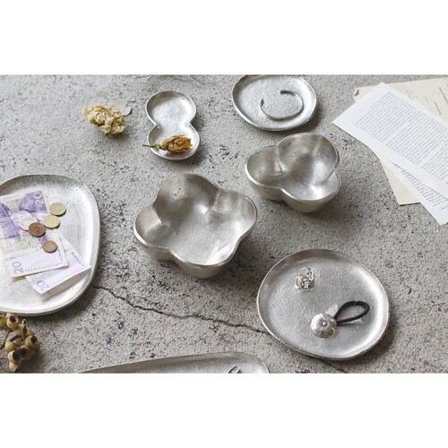素材本来のシルバー色を活かした「サントリナシリーズ」です。 鍵やアクセサリー、メガネなどを置くのにピッタリなアルミトレーです。 1点1点の個体差を魅力として楽しめるハンドメイド商品です。 |