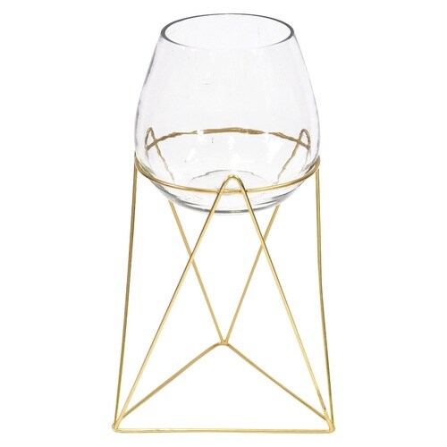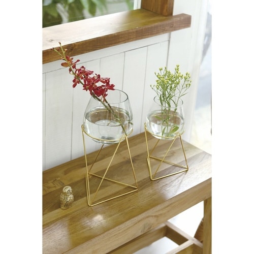 丸みを帯びたガラス容器にゴールドのスタンドを組み合わせたフラワーベースです。 挿し口が広いため、ボリュームのある花束から繊細なお花まで幅広く飾ることができます。 |