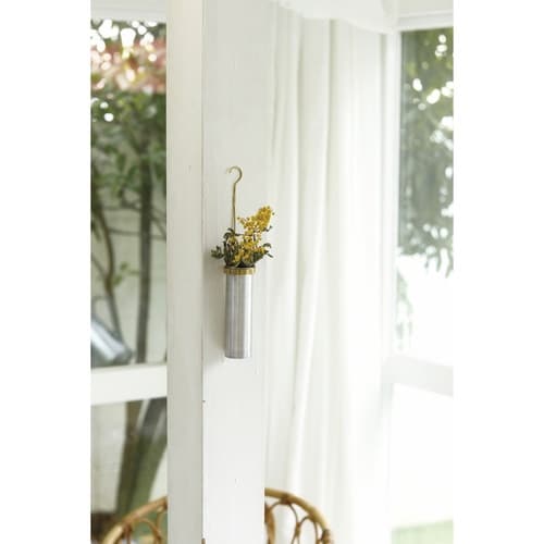 ブラスとアルミを組み合わせた吊り下げタイプのフラワーベースです。 フレームとアルミベースは取り外しが可能です。 吊り下げている状態でも水の入れ替えができます。 フックの柄の部分に「in |