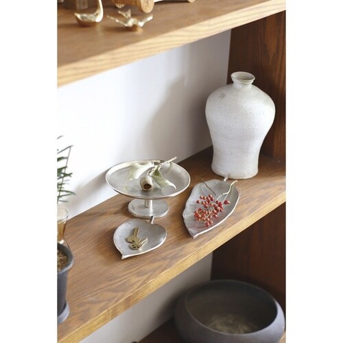 アルミ本来のシルバー色を活かしたハンドメイドのアルミトレーです。 表面の凹凸模様は、心を込めて一つずつ手作業で仕上げています。 ピアスやリングの見せる収納に便利なスタンドタイプです。 |