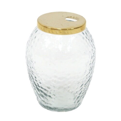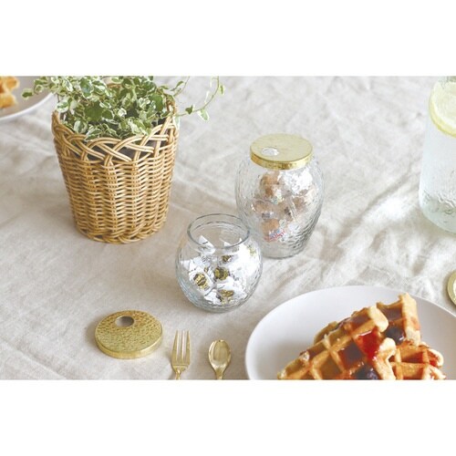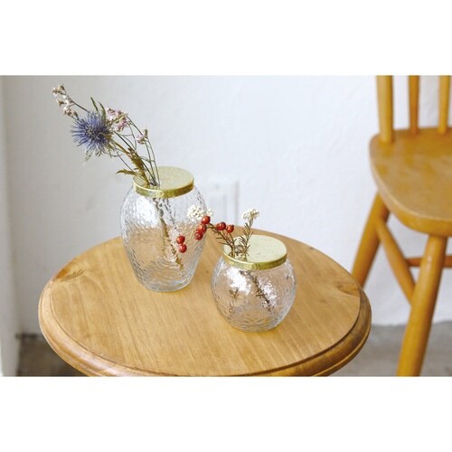 リサイクルガラスを使用したキャニスターフラワーベース Lサイズです。 フタとガラス部分はどちらもハンマートーン仕上げになっており、水面のような凹凸のある表情が特徴です。 |