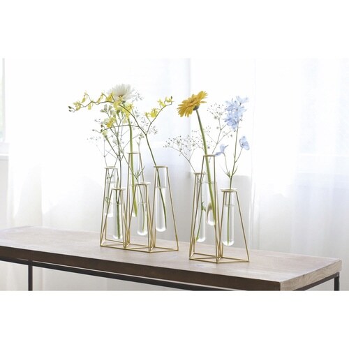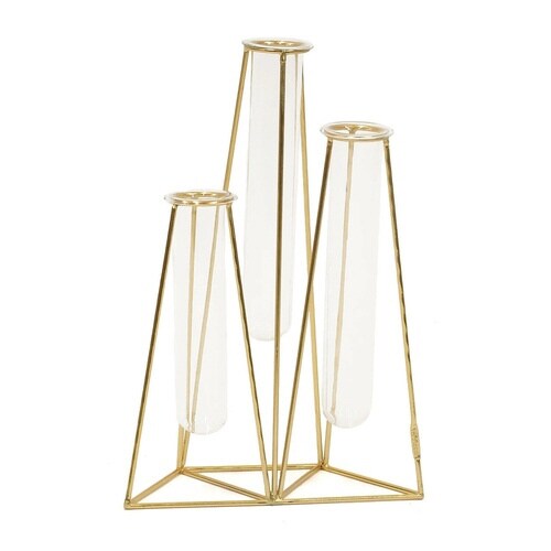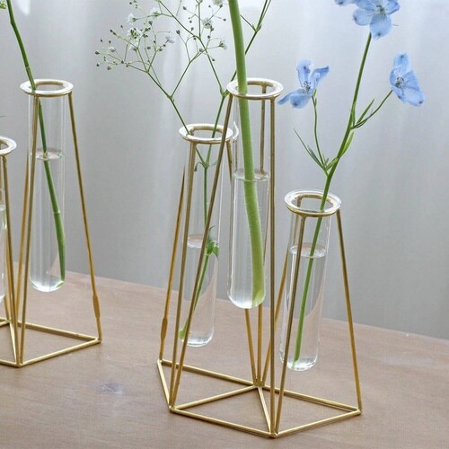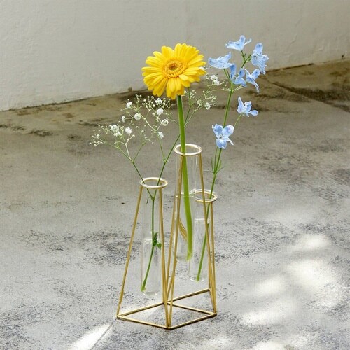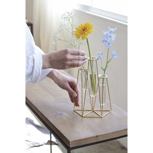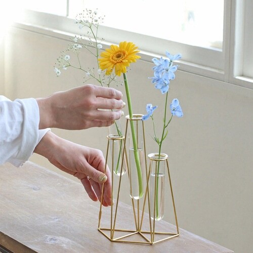 ゴールドのフレームとガラス管を組み合わせたフラワーベース3連です。 一輪挿しが連なったようなデザインで簡単にバランス良くお花を飾ることができます。 並べて飾るとより華やかに |